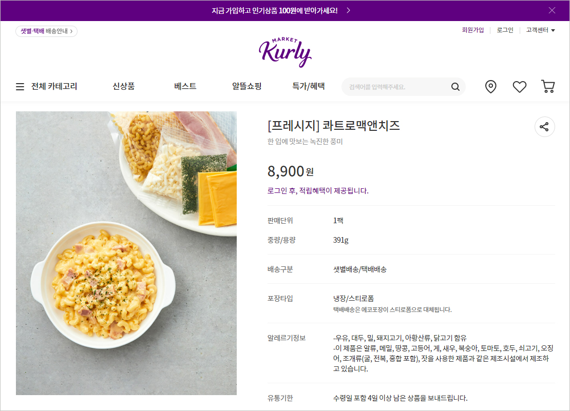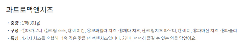 <마켓 컬리>에 네 가지 치즈를 쓴 맥캔치즈가 있길래 올려 봅니다. 영어 앞에 마구 붙는 저눔의 '콰트로'.