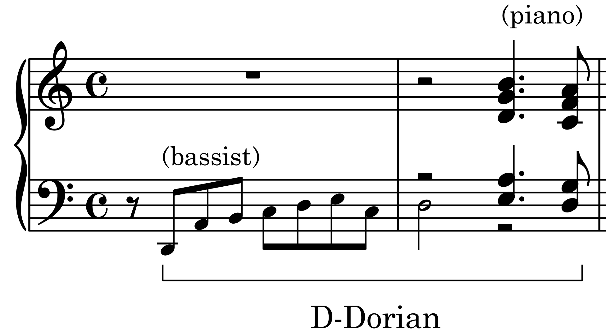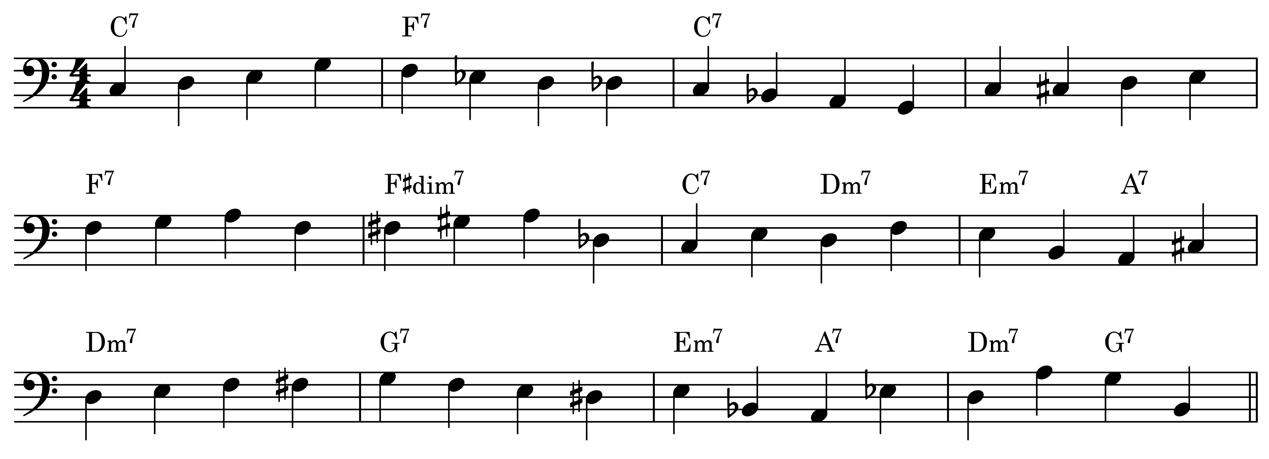 워킹 베이스는 (1) 화음chord을 구성하는 음들에 (2) 화음 구성음이 아닌 음non-harmonic tone들을 적당히 섞어 도약과 순차 진행을 골고루 갖춘, 균형 있으면서도 흥미로운 선율을 만드는 것을 목표로 삼습니다. 여기에 때로는 (3) 특정한 한 음을 고집스럽게 반복해pedal tone 인상적인 악구를 만들어 내기도 하고요. 워킹 베이스 악보는 대개 아래와 같이 생겼습니다. 4분음표 대신 8분음표가 쓰이기도 합니다. (이 글의 조각 악보 세 개는 다쓰베이더가 그렸습니다.)