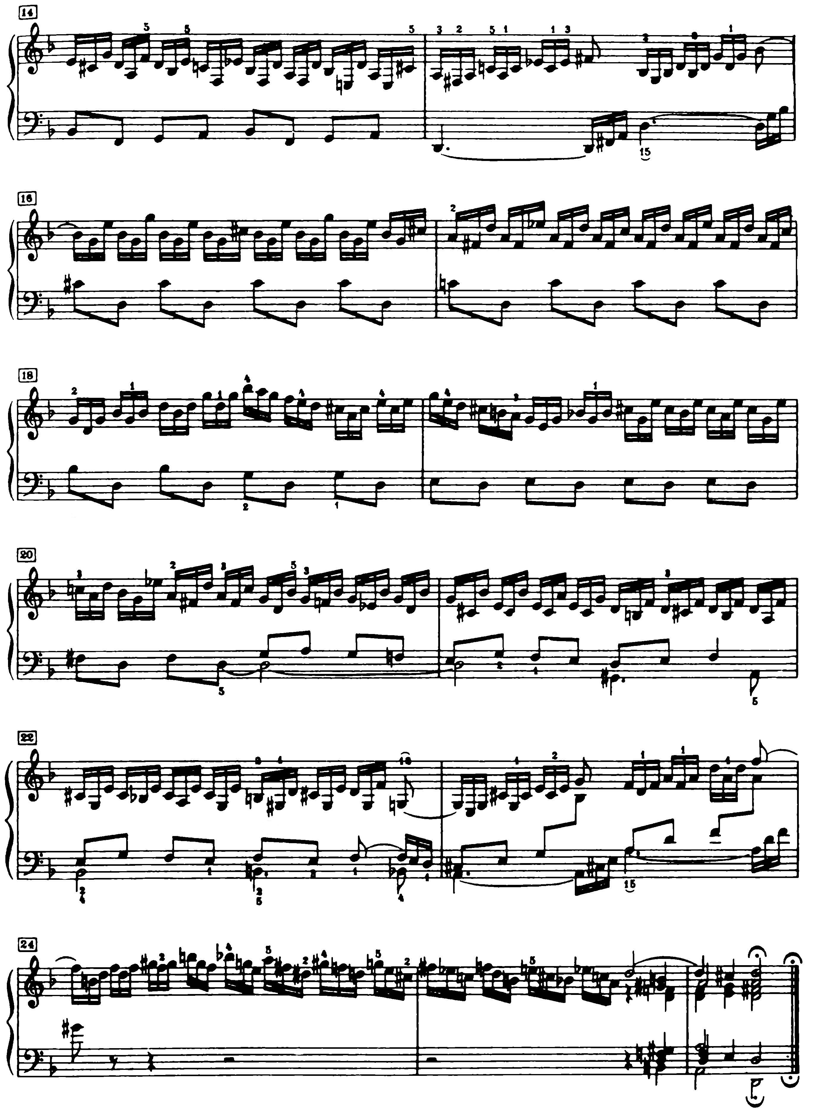 화성음과 비화성음, 그리고 고집스러운 페달음까지[16-21마디의 반복해서 울리는 왼손 D3음], 재즈와 대중음악에서 사용하는 워킹 베이스의 기본 요소들이 이 옛날 음악에 다 들어 있습니다. 독보 가능한 분은 연주를 틀어 놓고 아래의 악보에서 베이스만 따라 불러보세요. 매우 잘 만든 워킹 베이스입니다. 마침 리히터가 왼손 음표들을 특별히 짧게 끊어 더블 베이스처럼 들리게 연주합니다.
