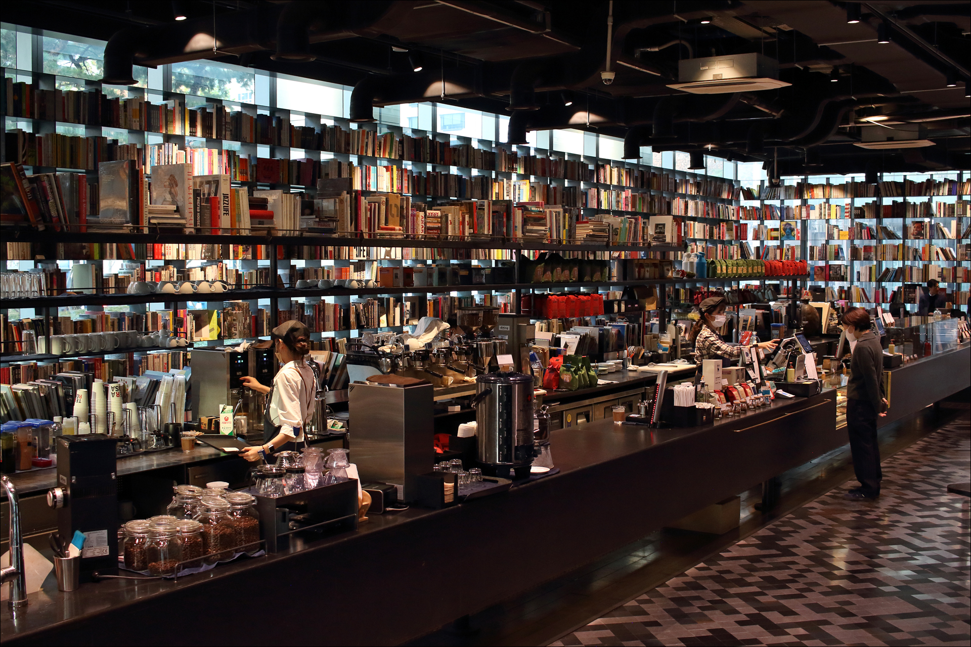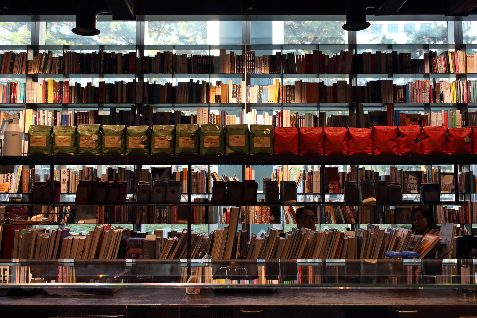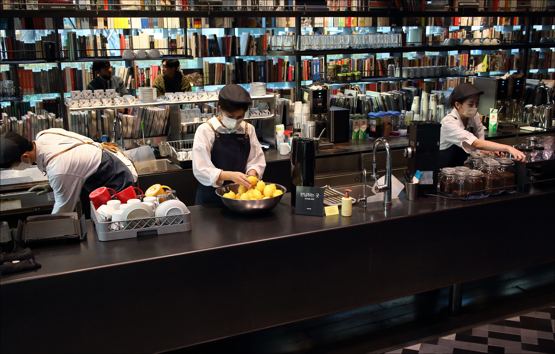왼쪽으로는 길게 뻗은 카운터석을 따라 책꽂이가 같이 뻗어 나갑니다.