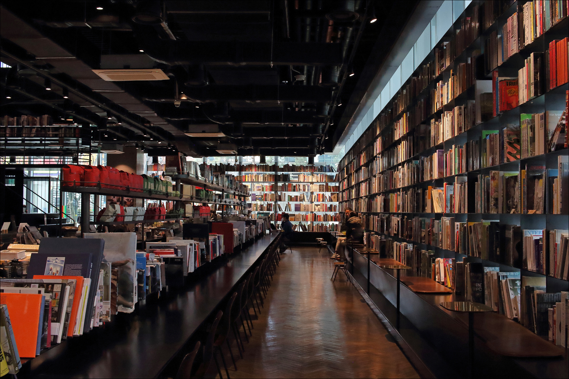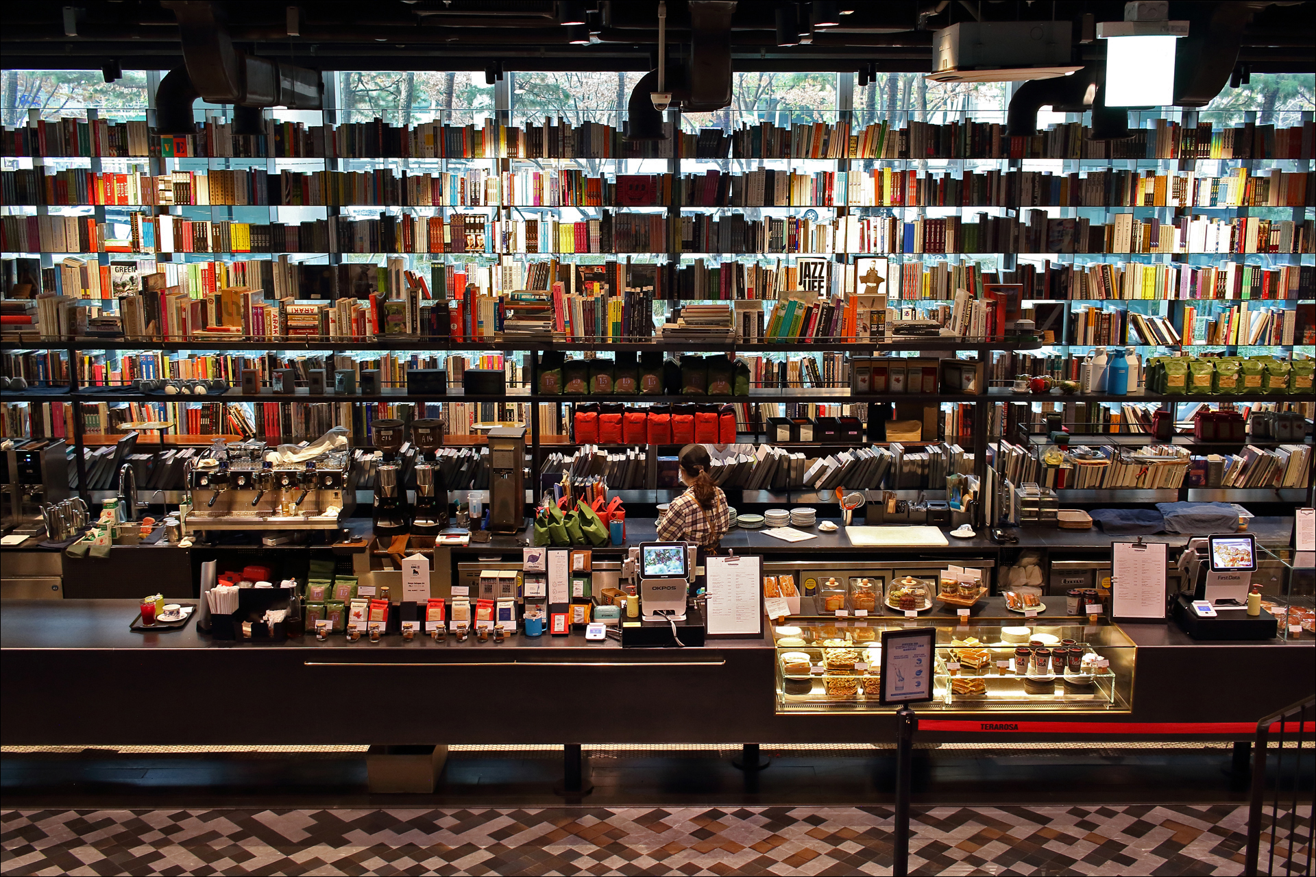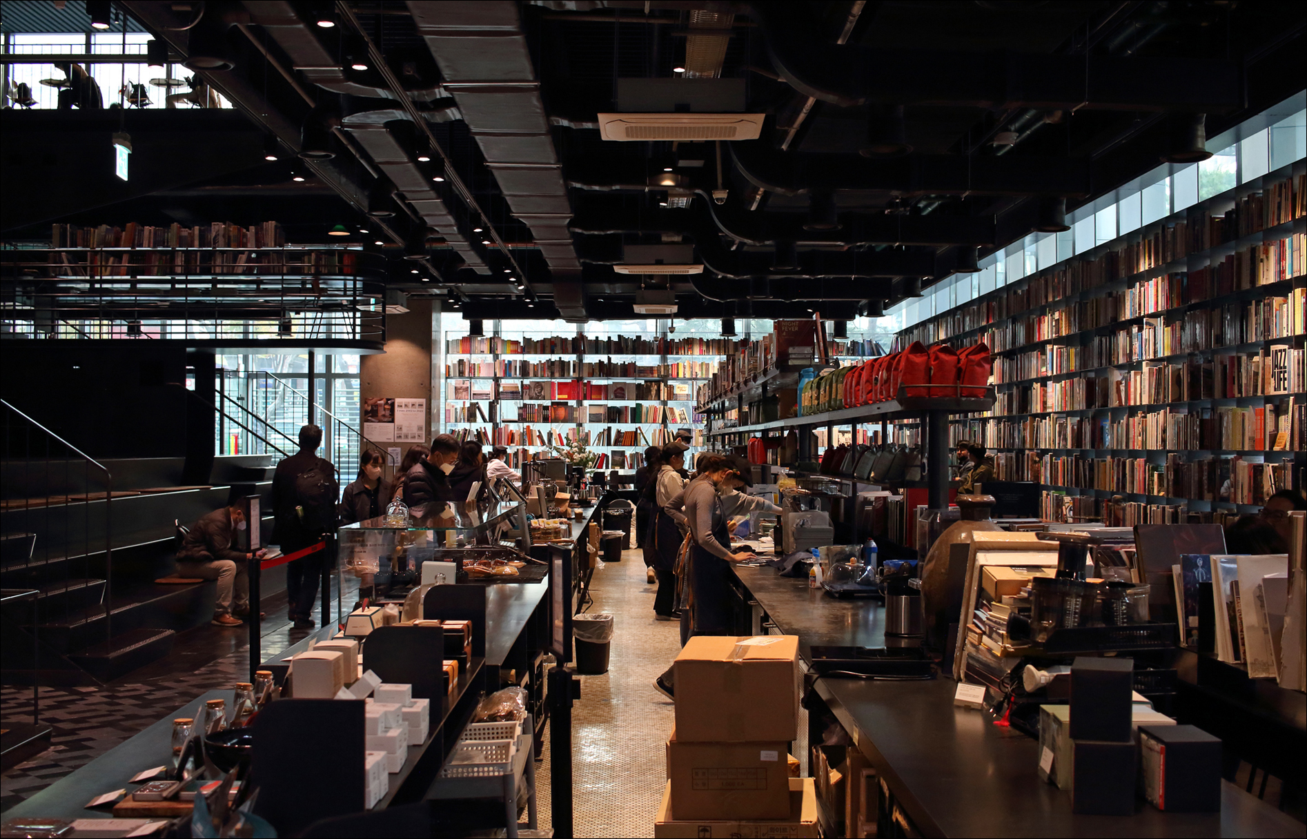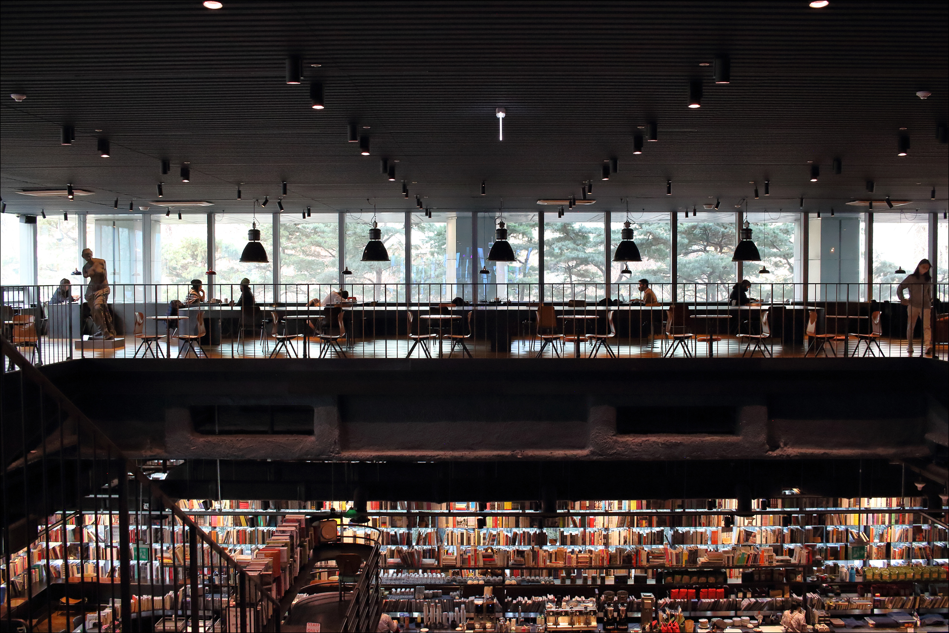 왼쪽으로는 길게 뻗은 카운터석을 따라 책꽂이가 같이 뻗어 나갑니다.