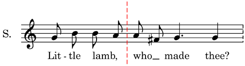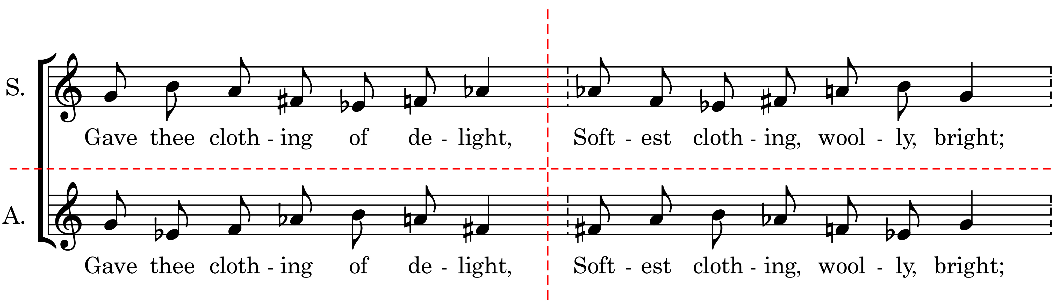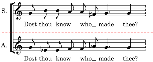 2. 그 다음 마디에서는 두 성부 사이에 완전한 상하 반전이 일어납니다. 이를 음악에서는 '전위inversion'라고 부릅니다. 대칭 모양을 살리느라 "who-"에서 아주 잠깐 불협화음이 되며 성부 교차가 일어나기도 합니다.