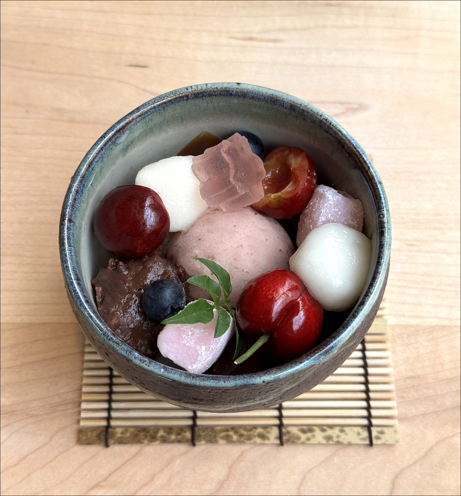 어설프게 익은 생과일이나 통조림 과일을 빼고 떡, 팥, 밤, 고소한 깨로 만든 경단 혹은 과자, 쌉쌀한 맛차 아이스크림 등을 담아 낸다면, 또, 식감도 좋지 않고 무미한 일본식 젤리 대신 맛 잘 낸 젤리를 쓰고 시럽 맛을 개선한다면 지금보다 훨씬 맛있을 수 있겠습니다. 일본 여행기들에서 이런 안미츠를 가끔 보는데 맛있어 보입니다.