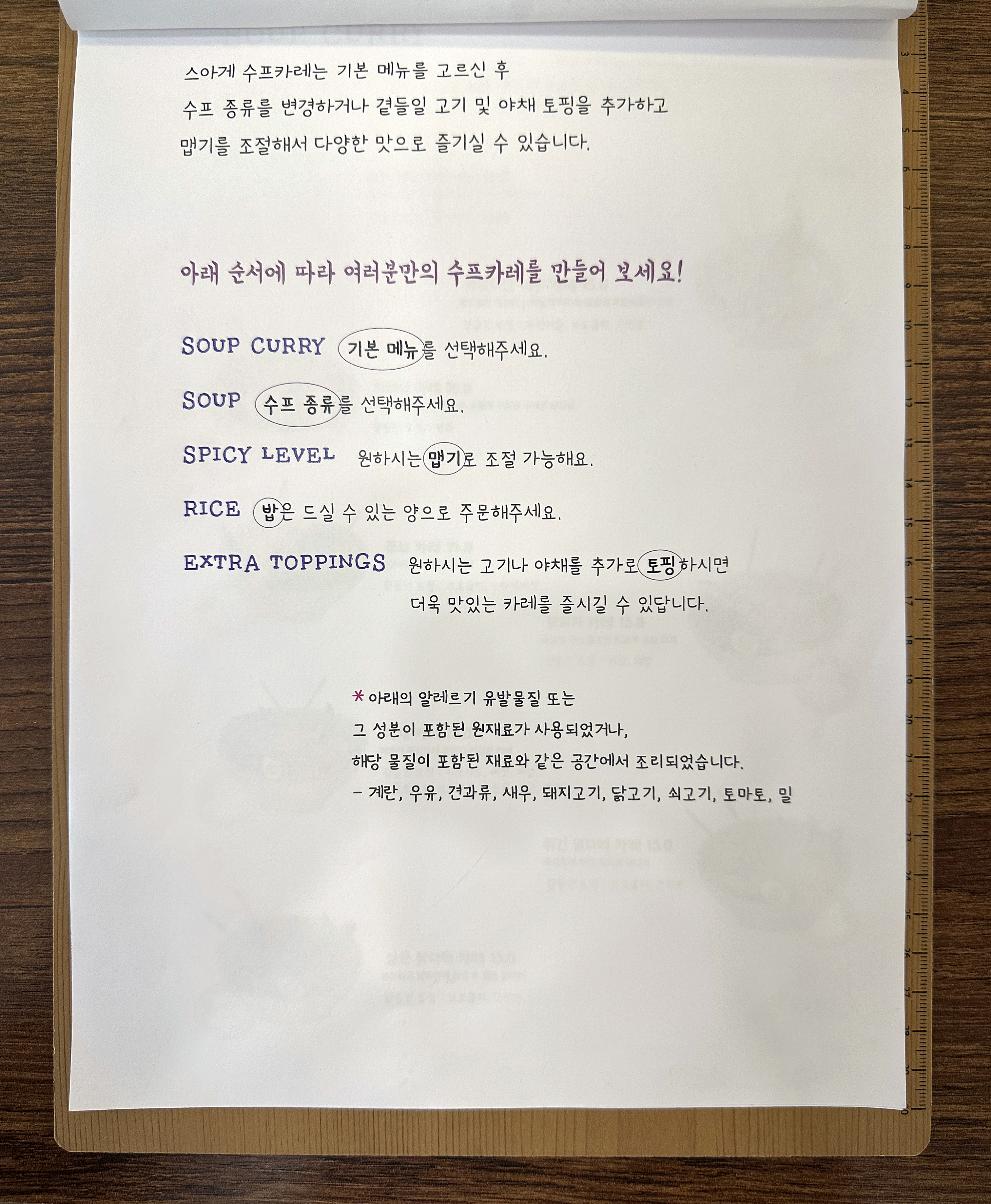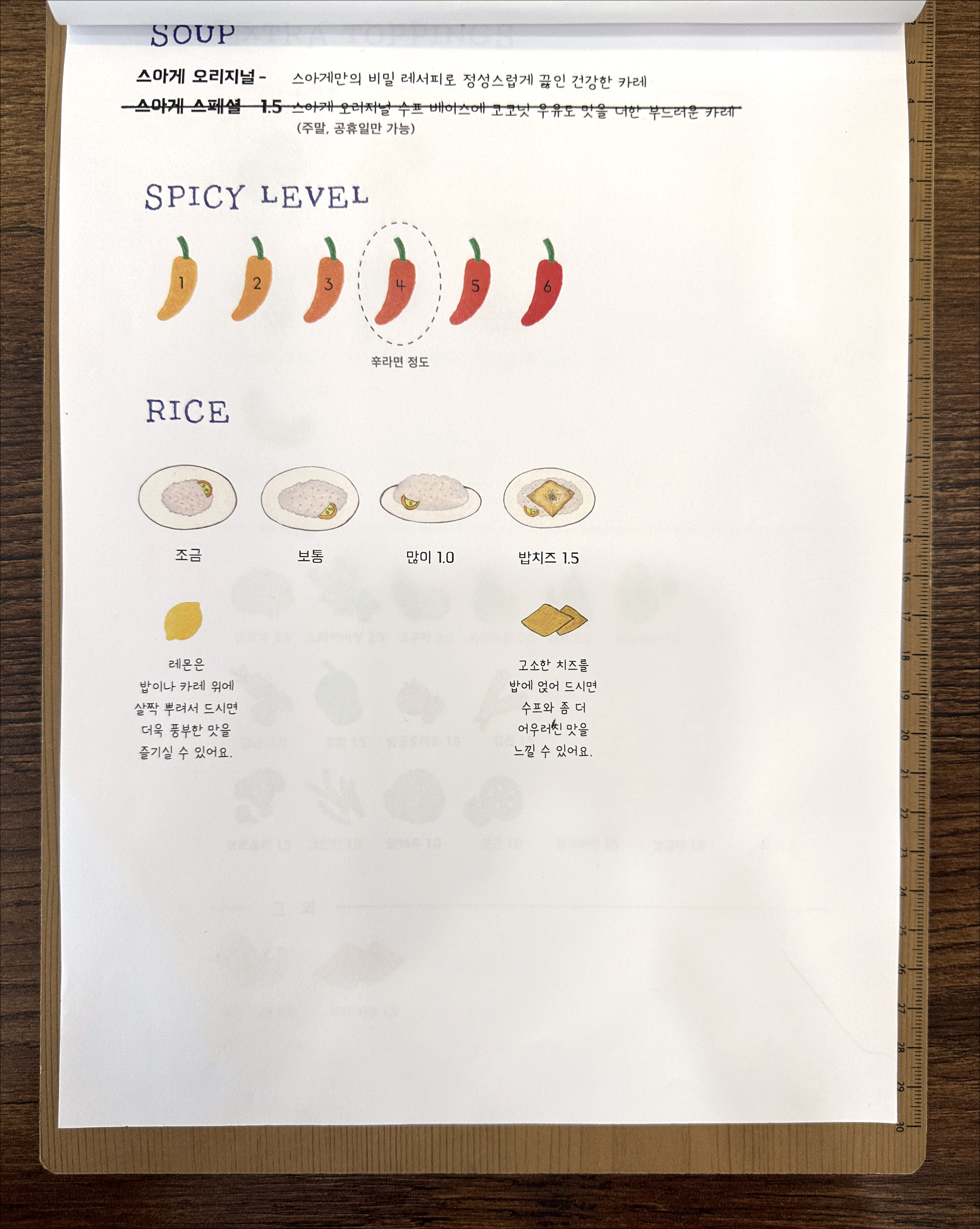 10대 20대라면 재미있어하며 이리저리 궁리해 나만의 스프카레를 주문하겠지만, 이제 막 개업해 가뜩이나 일이 손에 안 익어 느린 주방에 대고 손님들이 제각각 맞춤 주문을 하고 있으니 주문하는 데도 시간 걸려, 알바생이 주문서 받아 시스템에 일일이 입력시키는 데도 시간 걸려, 주방에서 주문서 뚫어지게 들여다보며 재료 하나하나 꺼내 준비하고 재차 확인하며 담느라 시간 걸려...