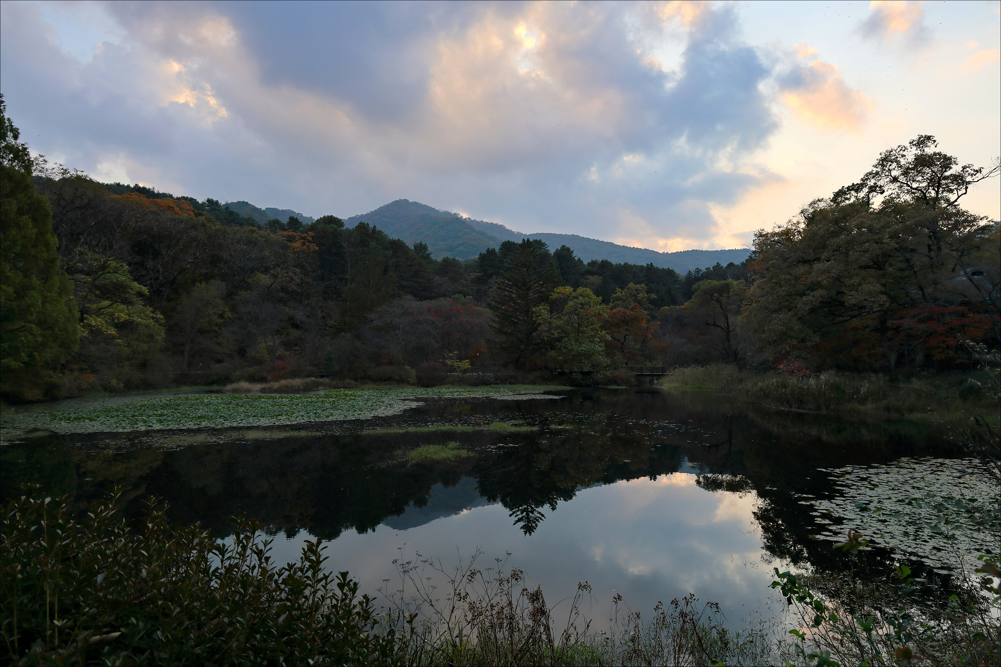 역광 촬영 시 암부를 밝게 만들어주는 HDR 기능이 고맙기는 하나 어떤 때는 그냥 시커먼 채로 두고 싶을 때가 있습니다. 전경-중경-후경에, 요란한 하늘에, 물에 비친 반영에, 물에 뜬 연잎까지, 구도가 다소 산만하고 프레임 안에 정보가 많아 암부는 일부러 손대지 않고 두어 정보양을 조금 줄여보았습니다. 어차피 해가 지고 있었으니 어두운 것도 나쁘지 않습니다. 클릭해서 큰 사진으로 보면 좀 더 밝게 보이기는 합니다. 요즘은 아예 사진기 안에 HDR 기능이 들어 있어 촬영 전에 선택할 수도 있고, 스마트폰은 이런 상황에서 기본으로 HDR 촬영을 해주므로 후보정 하는 시간을 아껴줍니다. (호수 위 좁은 나무 다리 위에서 찍어야 해 구도가 이렇게밖에 나오지 않습니다.)