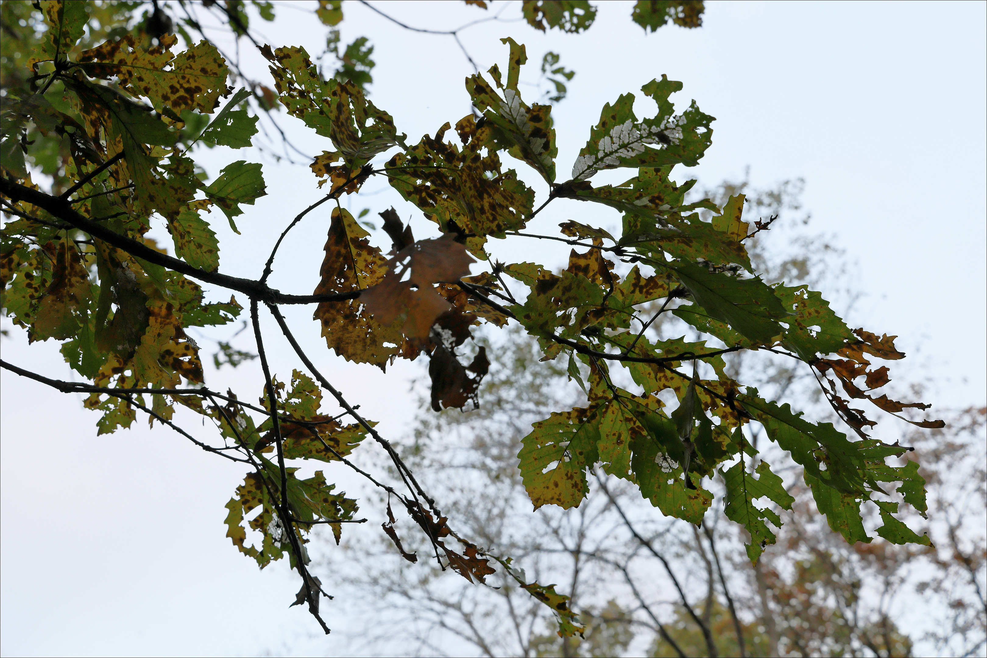 나무들마다 잎을 전부 벌레한테 뜯어먹혀 구멍 숭숭 너덜너덜 얼룩덜룩.
