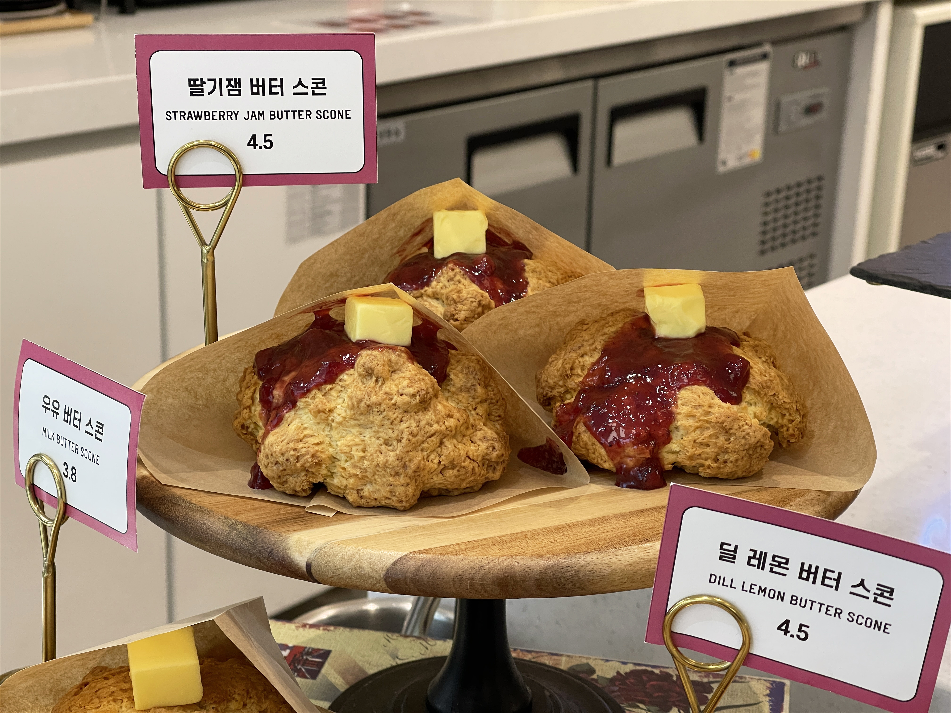 영국에서는 스콘에 크림 혹은 버터와 딸기잼을 곁들인다는 걸 잘 알고 매장 취식 손님의 '편의'를 위해 미리 곁들여 놓았습니다. 그런데 결코 편할 것 같지가 않아요. 흘리거나 손가락에 묻히기 쉽겠어요. 포장지에 빼앗긴 잼 닦아 먹느라 어쨌거나 성가시겠습니다.