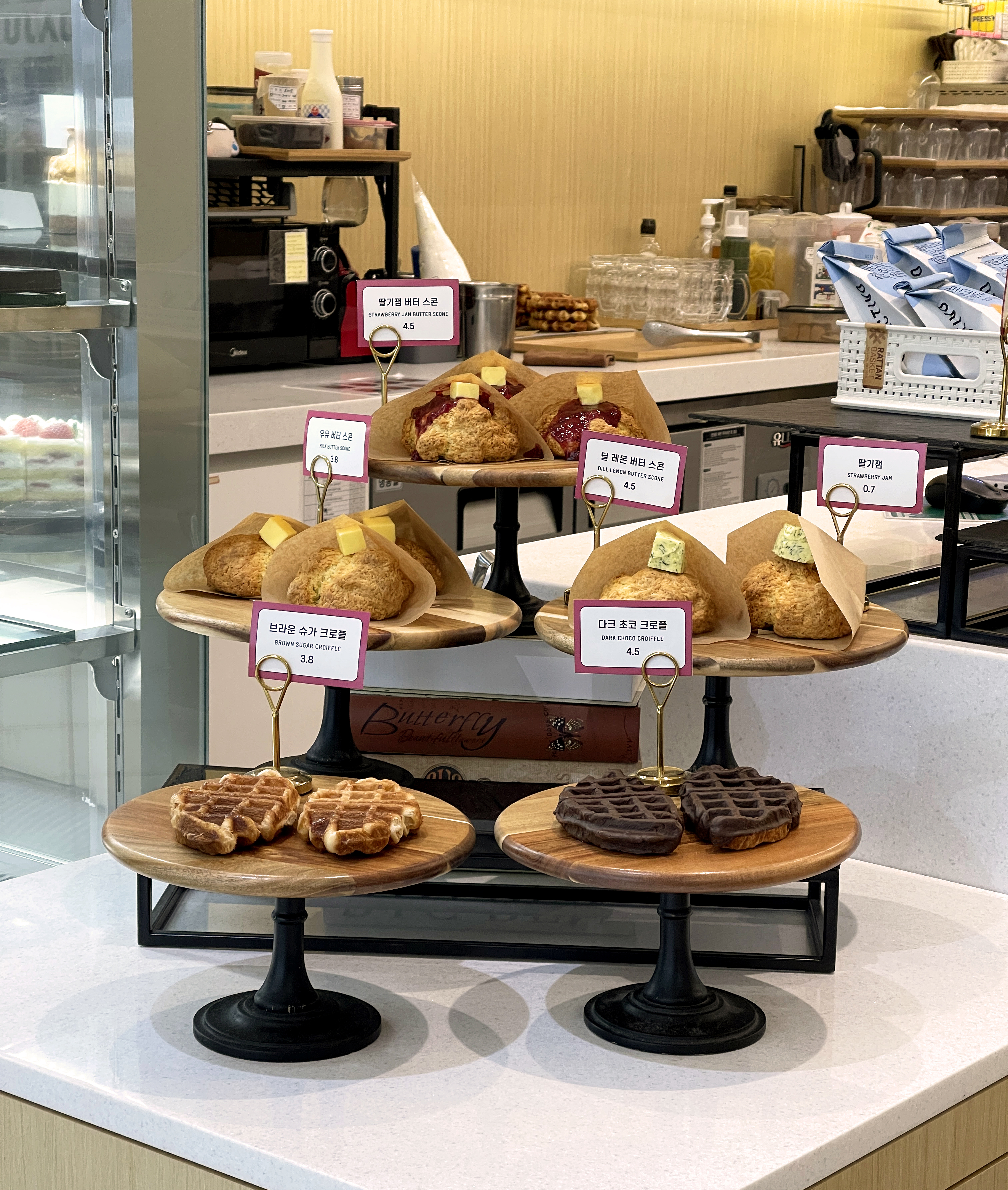 '케이크샵'으로 불리는 집이지만 크로플(croissant + waffle)과 스콘도 눈에 띕니다. 크로플 위에 이것저것 화려하게 얹어서 내는 '크로플 케이크'도 주력 상품인가 봅니다.