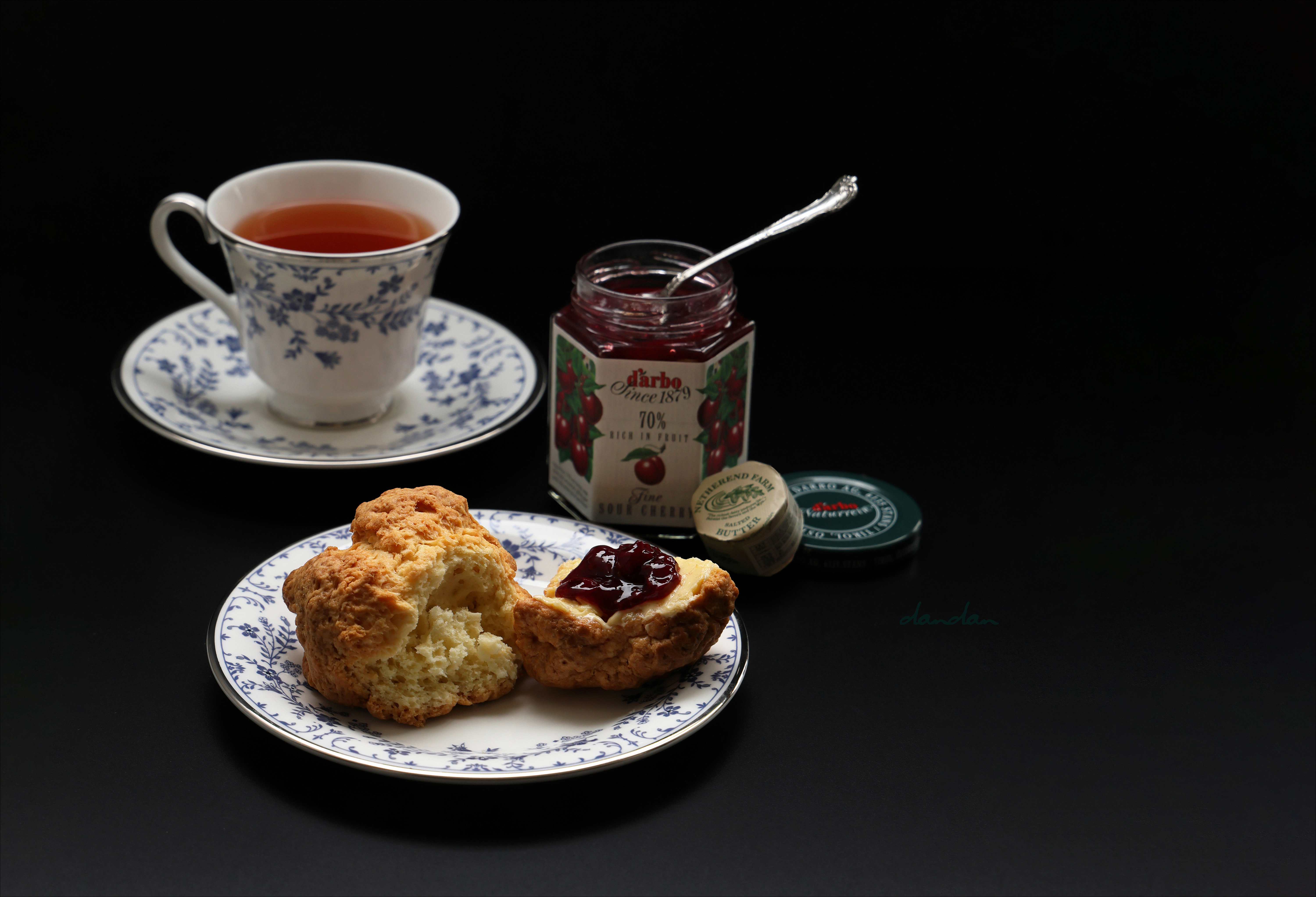 올려준 버터 양이 하도 적어 내 집 버터를 추가로 꺼내고 쨍한 신맛의 사워 체리 잼도 곁들였습니다. (잼 소개는 따로 합니다.) 클릭해서 큰 사진으로 보세요. 스콘 속살의 질감, 버터와 잼의 윤기가 생생히 잡혔습니다. 티 트리오tea trio는 1981년에서 85년까지 생산되었던 영국 <로얄 덜튼Royal Doulton> 사의 '사파이어 블로썸sapphire blossom'입니다.