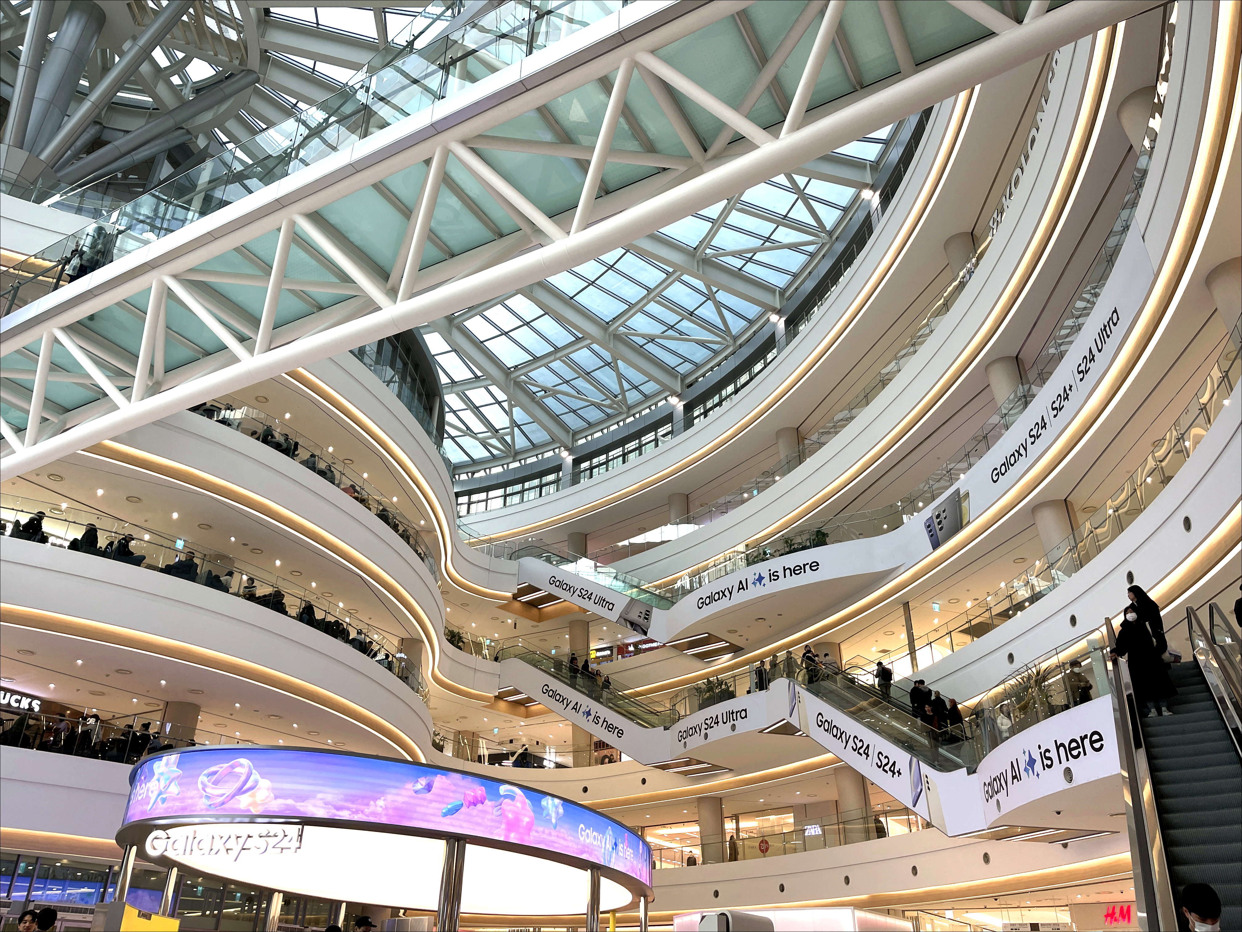 영등포에 있는 대규모 복합 쇼핑몰인 <타임스퀘어>입니다. 1층에서 올려다보며 찍었는데, 공상과학스럽고 근사하죠? 이곳 지하 1층과 지상 3층에,