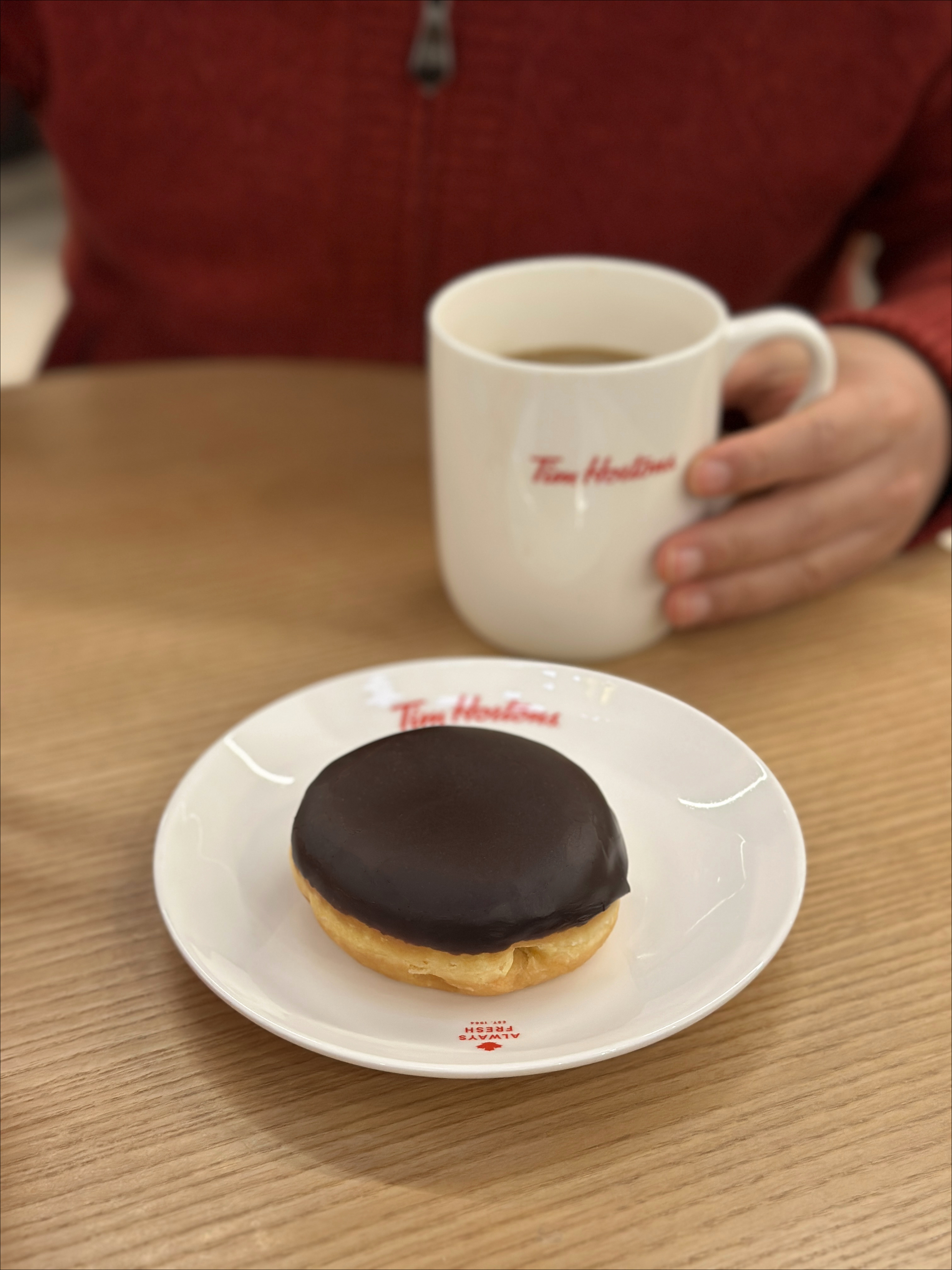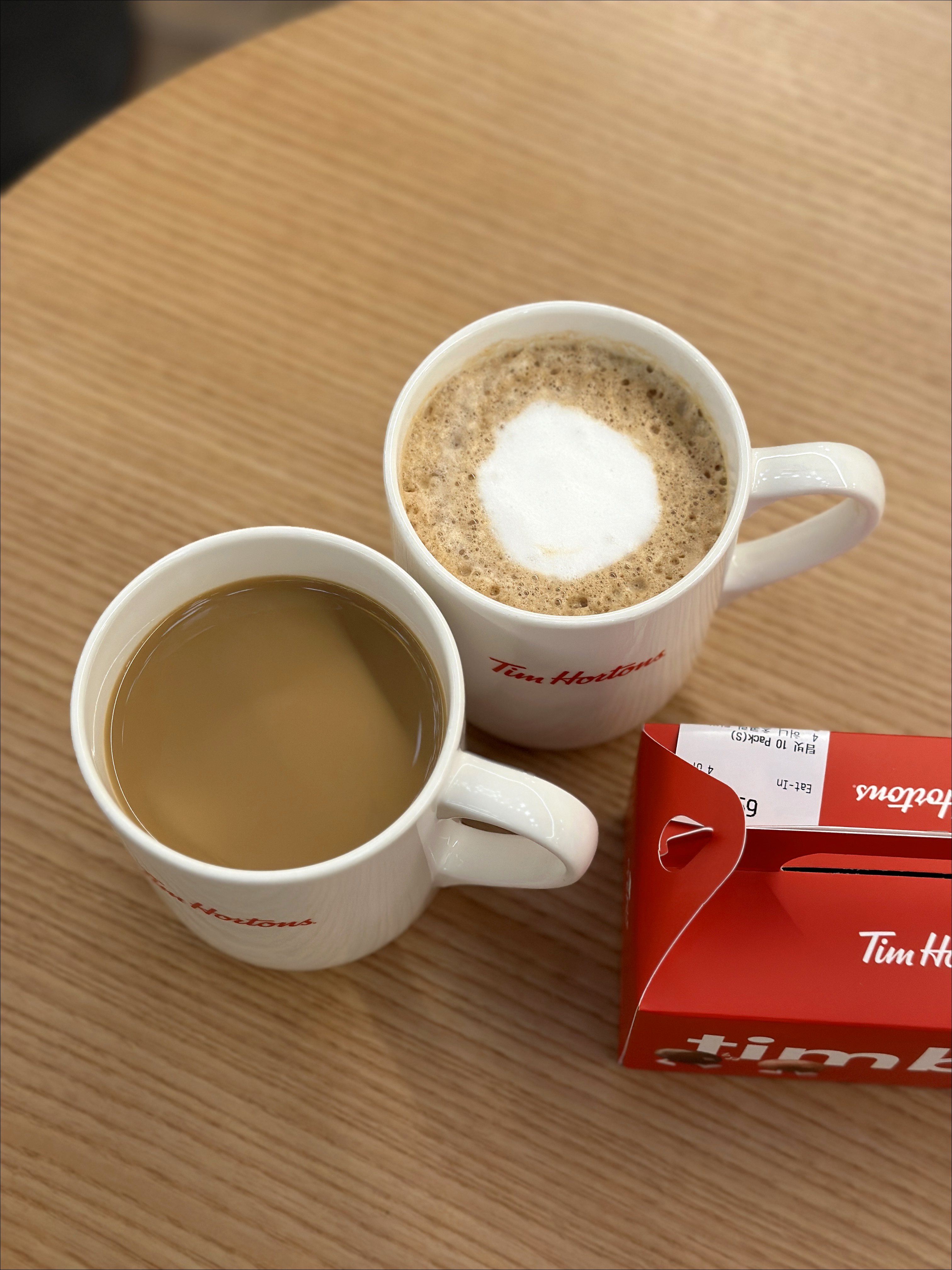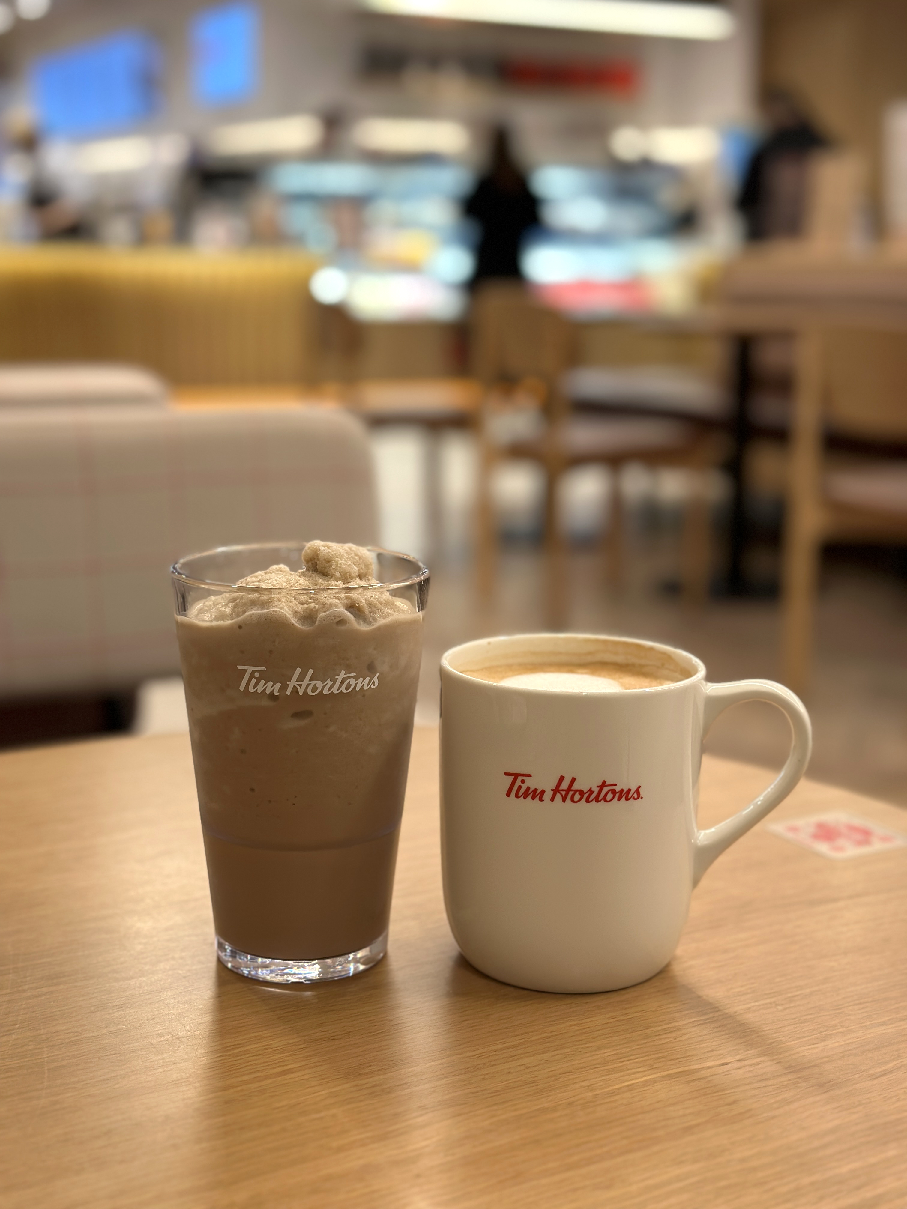 커피 옆에 있는 빨간 상자에는 작고 동글동글한 도넛 '팀빗Timbits'이 들었습니다.