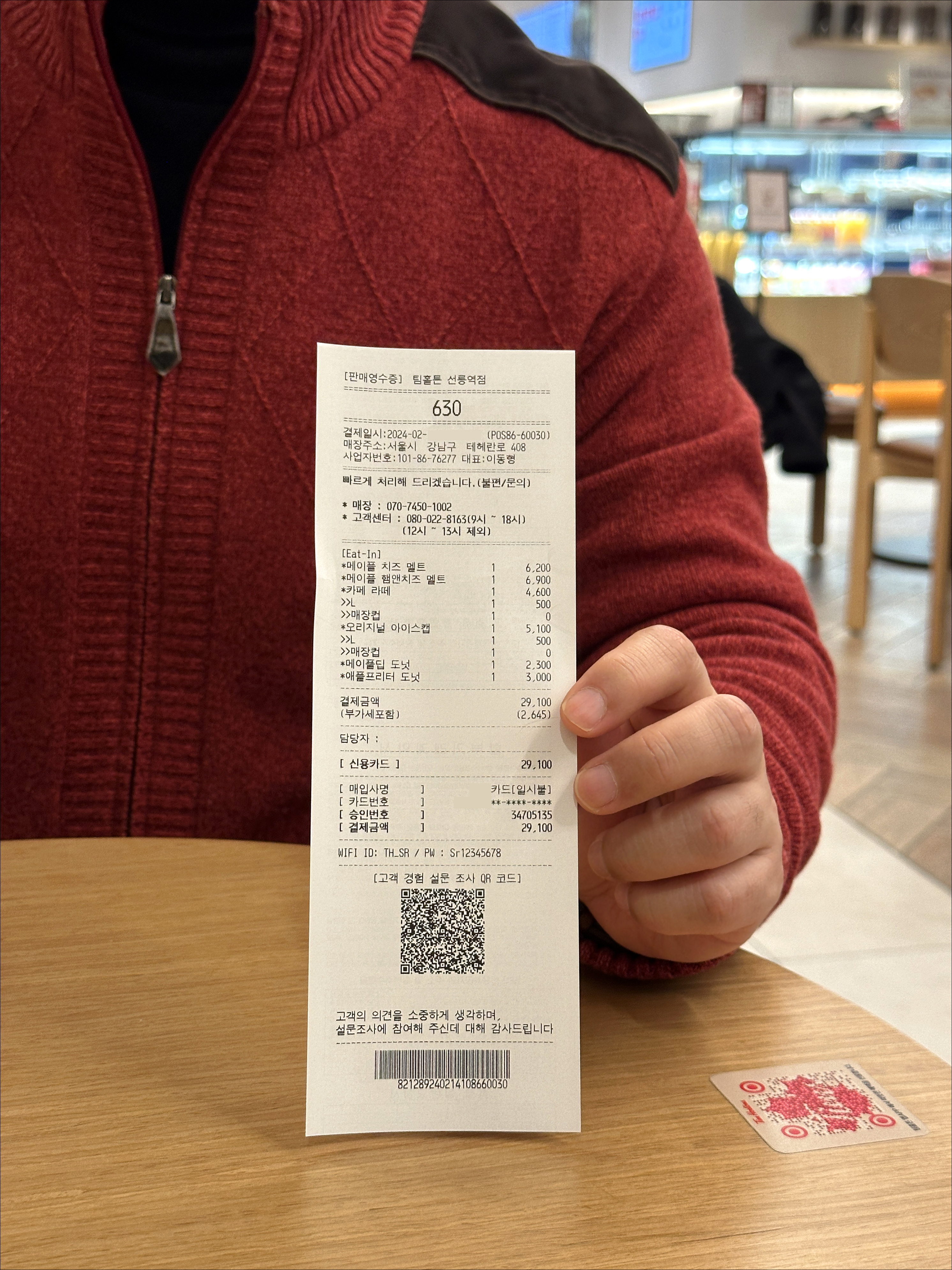 직원분들이 다들 요청도 잘 들어주시고 질문에도 잘 응대해주십니다. 진동 벨을 쓰지 않고 일일이 호명해주니 손님은 친근함을 느낄 수 있어 좋으나 직원분들은 목 아프겠어요. 손님 별명들에 재미있는 게 많아서 도넛 먹다 말고 웃기도 했습니다. 저 보세요, "부랑자". 다른 날에는 "살려주세요" 님도 있었는데, 직원분이 힘차게 부르고 나서 웃음을 참지 못하는 것 보고 같이 웃었습니다. ㅋ 저도 클럽 홍보를 위해 "스콘 클럽 회장"이라고 할까 고민중입니다.