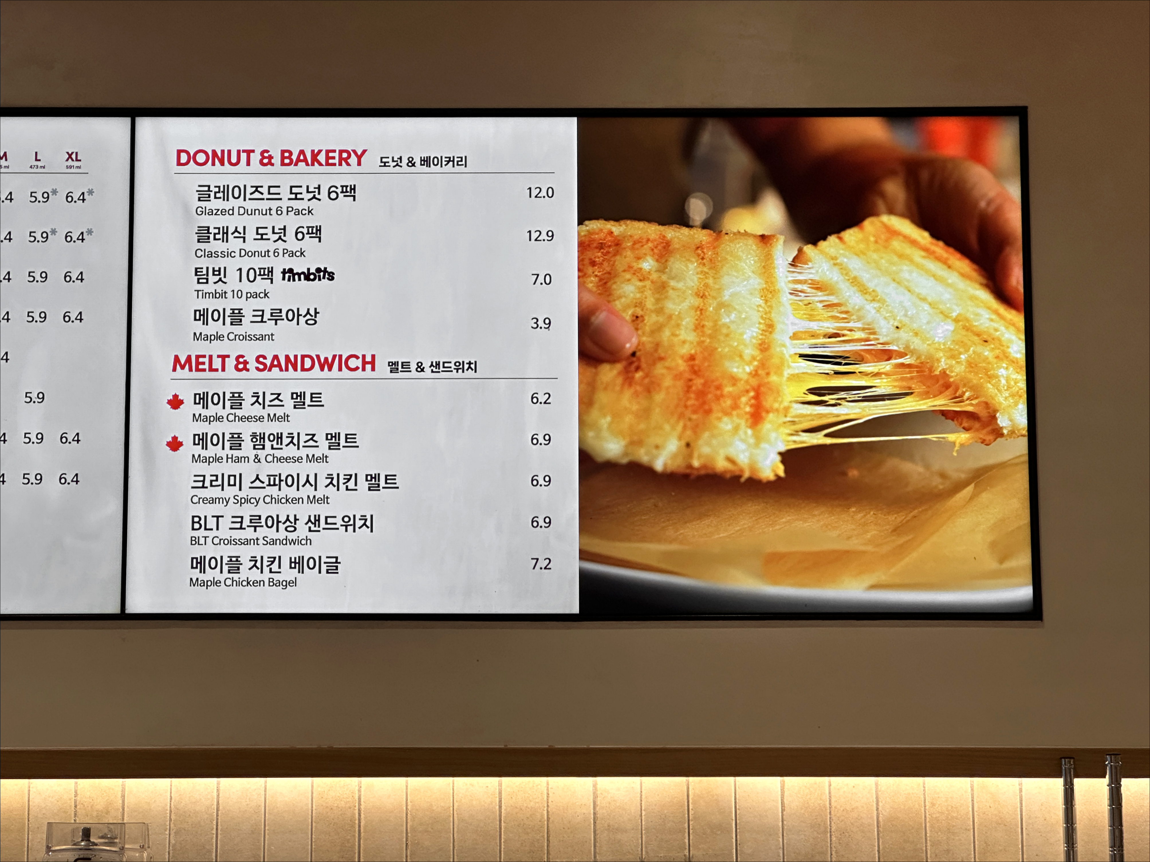 이 집에서 뭔가를 먹을 생각에 아침을 굶고 와 저기 저 먹음직스러워 보이는 '메이플 치즈 멜트'와 '메이플 햄앤치즈 멜트'를 주문했습니다.