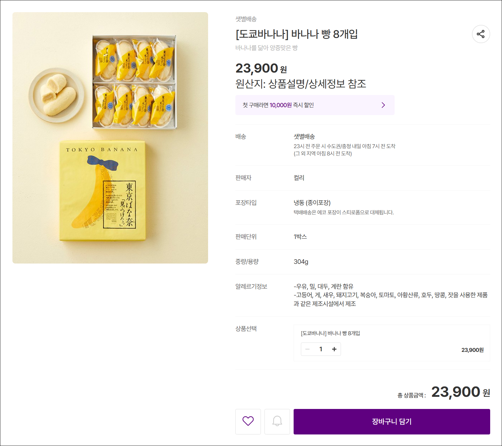 바나나크림 52.54%[물엿, 바나나페이스트 5.07%, 설탕, 바나나퓌레 2.56%, 팜유, 탈지분유, 난황, 밀가루, 젤라틴, 소브산칼륨(보존료), 젖산, 천연향료(바나나향) 0.01%], 계란, 설탕, 밀가루, 옥수수기름, 글리세린지방산에스테르, 자당지방산에스테르, 난백, L-글루탐산나트륨(향미증진제), D-소비톨, 대두레시틴(유화제, 유전자변형대두 포함 가능성 있음), 탄산수소나트륨, 푸마르산, 글리신, 천연향료(바나나향) 0.1%, 카로틴. 끝.